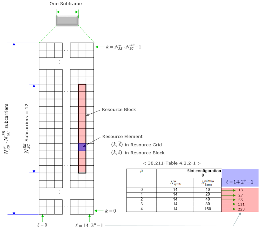 Here we can see from the table in the image that for different value of µ, we get different number of slots in each subframe . The green three dots in the slots part shown , describing that it can be vary according to the value of µ .