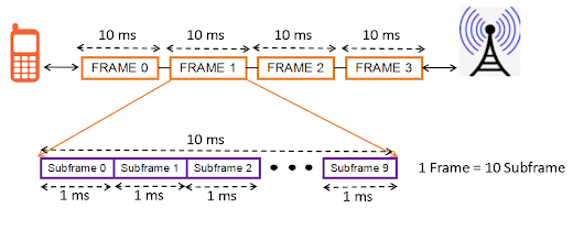 Now , each frame compromises of 10 subframes , which gives us the duration of each subframe which is about 1 ms.