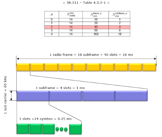 Here in the image above , as each subframe is divided into 4 slots for µ value as 2 now the time duration of subframe (1 ms) is divided into 4 slots and give rise to 0.25 ms time for each slot in each subframe .