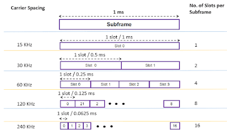 Now as each subframe its of 1ms time duration now if each subframe divided into 1 slot for µ value zero ,then slot has also its time duration of 1 ms. For 2 slots (µ value as one) , time duration of subframe (1 ms) divided into 2 slot as 0.5 ms for each slot in each subframe .