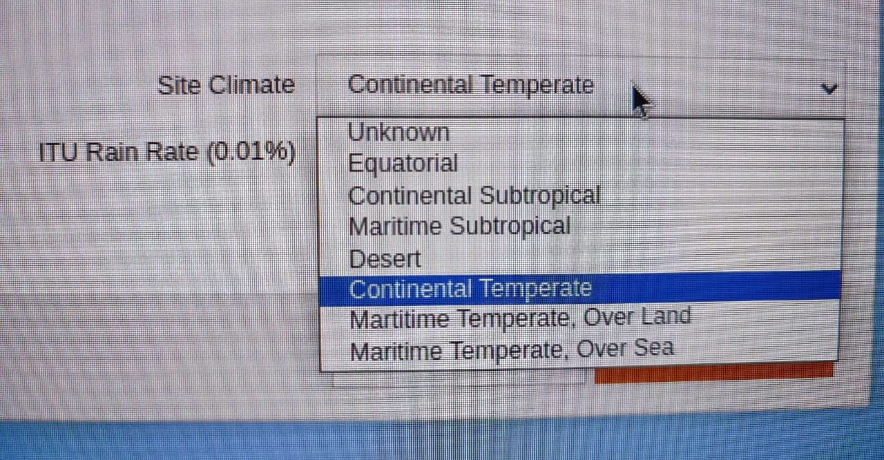 Site Climate, is defined by region. hmmm… i’m not sure about how this parameter is manage on 3GPP or ITU, but what missing from climate data is (temperature, water vapour density, atmosphere pressure, refractivity, isotherm height, & fog intensity), may be all those paramater is modelled at site climate (i’m not sure).