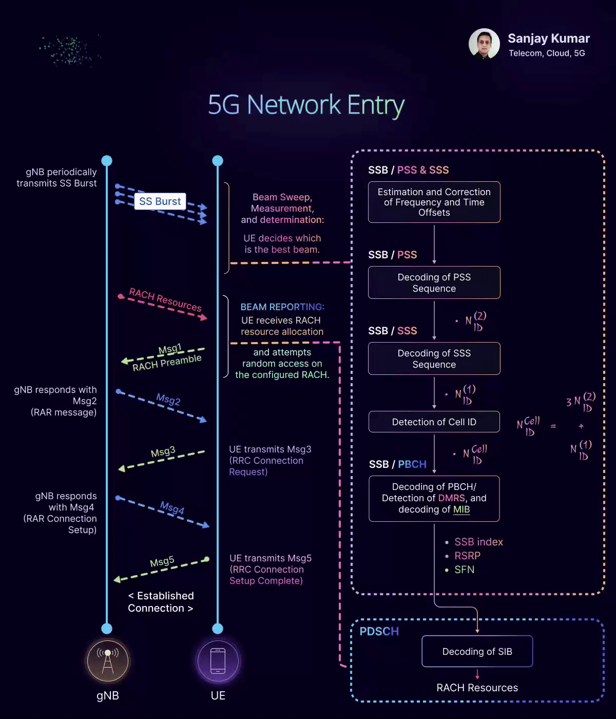 5G Network Entry refers to the process and procedures involved in connecting a user device to a 5G network. This involves several steps and interactions between the device (User Equipment, UE) and the network infrastructure (including the gNB, which is the 5G base station, and the core network).