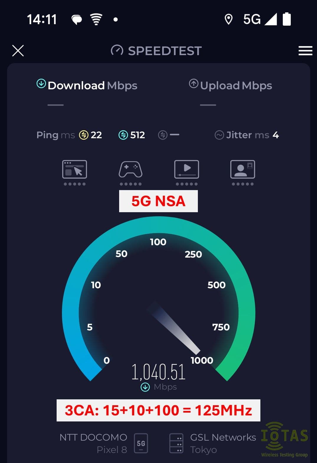 This wasn’t a lab. Just a standard Pixel 8 connected to NTT Docomo in central Tokyo, showing what 5G NSA can do with decent signal and well-tuned scheduling.