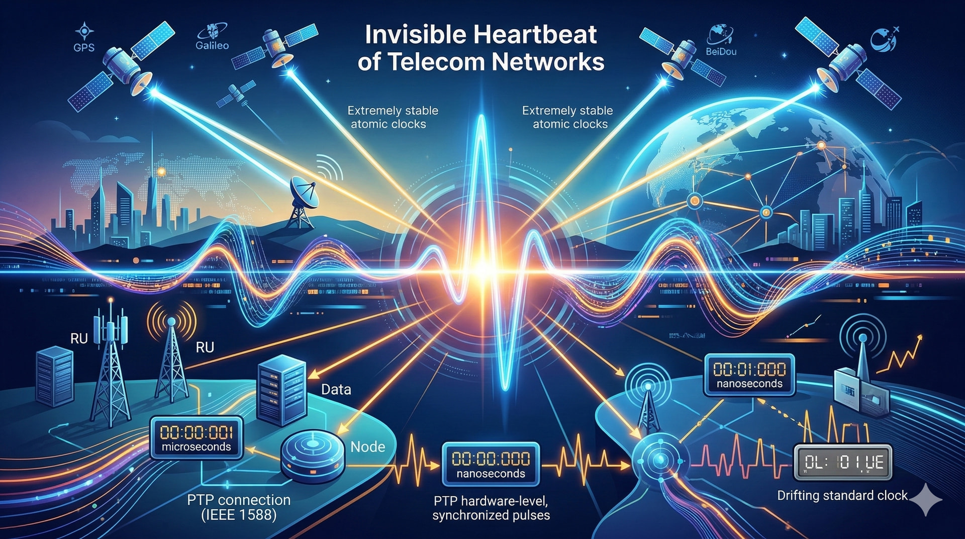 How does a mobile operator manage synchronization across thousands of geographically dispersed cell sites? In a critical infrastructure environment like telecom, what mechanisms prevent a total system failure if a primary timing source is lost? Furthermore, how do we guarantee that individual cells maintain the nanosecond-level phase synchronization required to support sub-1ms decision-making and low-latency Telecom services?"