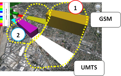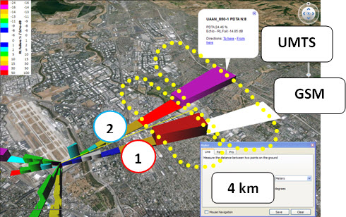 Analyzing specific cells, for example ‘AAN’, we see that the same coverage area is much larger than it should (overshooting cell), both the GSM (1) and UMTS (2) are more than 4 km of the serving cell.