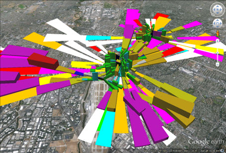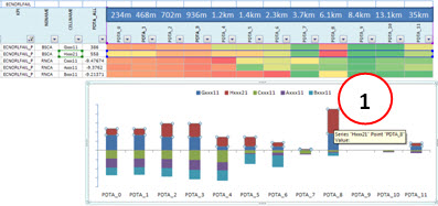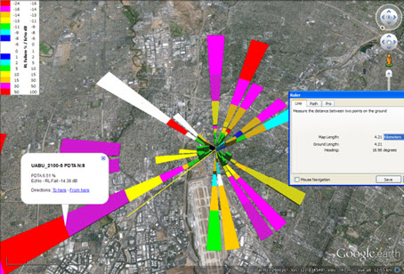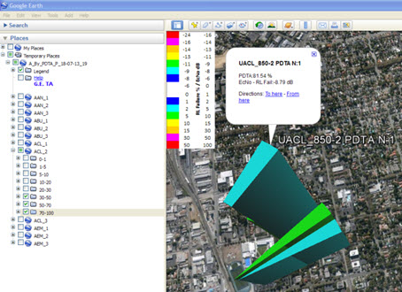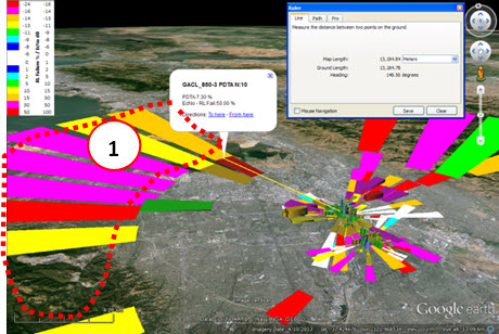 To analyze the PDTA distribution in Google Earth, we use a report generated by the ‘Hunter GE Propagation Analyzer’ module*, and so we need to know the criteria that we are using: in this report, the heights (1) from each region (PDTA of 0 to 11) represent the percentage of samples in that region. And the colors (2) represent the Quality: EcNo to UMTS, and Radio Link Failure % for GSM. *Note: you can build your reports in Google Earth and/or Mapinfo, just follow and apply the concepts presented here to your own tools/macros.