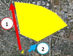 In this way, we indirectly get a map with the distribution of users, or their probable location area, corresponding to the coverage area of the cell, with a minimum and maximum radius. The following figure shows this more clearly, for an antenna with 65 HBW, and maximum (1) and minimum (2) radius.