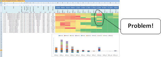 Using data from simple counters, we already have excellent ways of analysis like charts and graphs. For example, the following is a complete view of a particular sector of our network (all cells of all technologies and all carriers). Note that the simple thematic distribution obtained with Excel Conditional Formatting already gives us a clear vision of this sector.