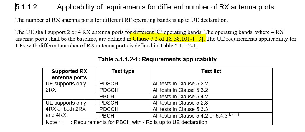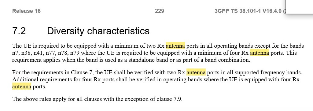 I found this on internet: The standard requires 4 RX (reception) antennas for 5G bands with 3.5 GHz (TDD) as well as n7 2.6 GHz (FDD), n38 2.6 GHz (TDD) and n41 2.5 GHz (TDD).