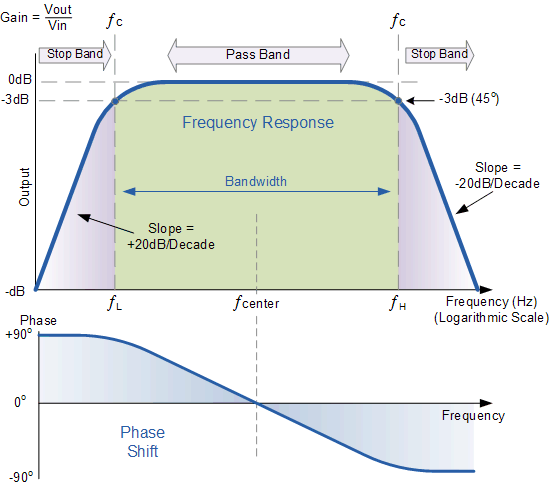 In the top graph, the flat region represents the passband where signals are transmitted effectively while the cutoffs (fL and fH) mark where the output drops by 3 dB, setting the practical bandwidth.
