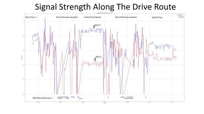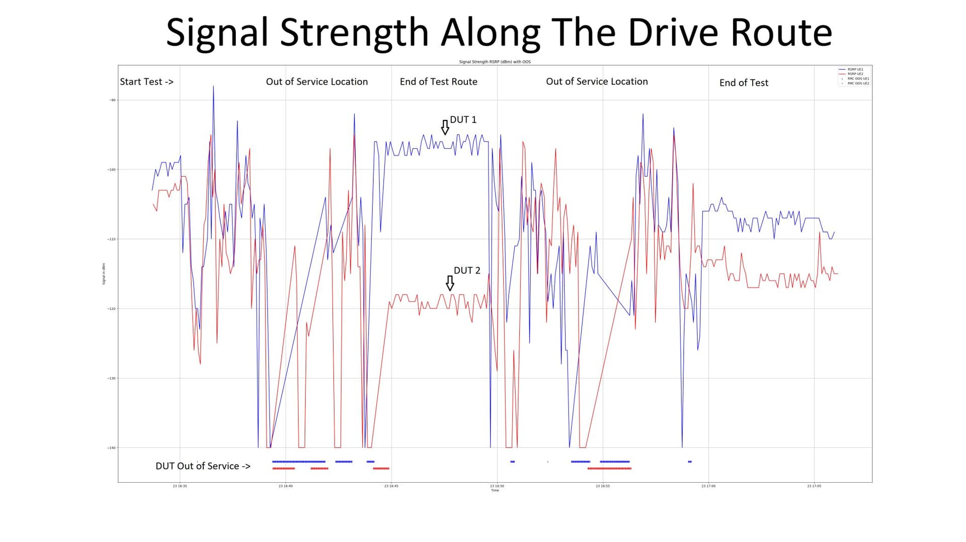 This field test compared two LTE CAT-M devices running in parallel on the same drive route with known out-of-service zones. The graph shows RSRP (signal strength) over time and reveals an unexpected truth.