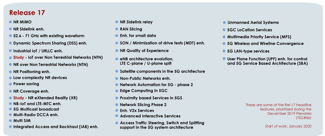 R17 include list of features for bend towards automation, connected world, satellite network, etc.