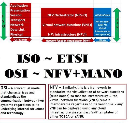 Just like every layer in OSI has its protocols, applications & rules to coordinate with other layers. Similarly, every layer in NFV+MANO contains its components & rules to coordinate with other layers.