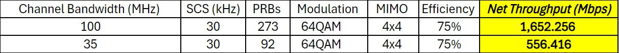 - Weโll use example bandwidths of 100 MHz and 35 MHz with different SCS values to determine the number of PRBs and calculate the throughput.