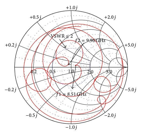 Th Smith Chart below shows how the antenna’s impedance traces move across frequency, revealing both matching quality and reactive behavior for its dual-band operation. The red loops illustrate how each band shifts across the chart, highlighting where VSWR ≤ 2 is achieved and where detuning or strong reactance appears.