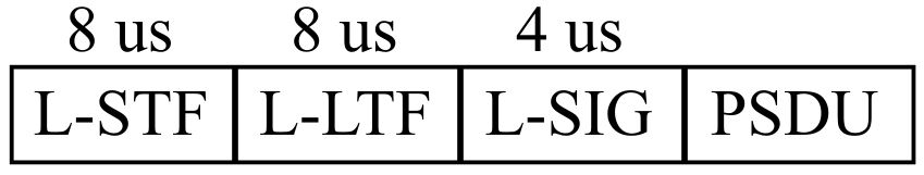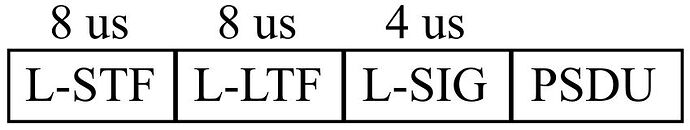 The PHY layer of a Wi-Fi transmitter sends a frame (formally called PPDU) in a specific format as shown in the picture. The PSDU portion in the PPDU is basically the PHY layer payload. The PPDU starts with a 8us long Legacy Short Training Field (L-STF) which comprises a periodic signal with 0.8us periodicity. This is a followed by a 8us long Legacy Long Training Field (L-LTF). The 0.8us periodicity property of L-STF can be used by a receiver to perform Automatic Gain Control (AGC) and detect a Wi-Fi signal (perform self correlation and apply a detection threshold for example) and . By the end of L-STF, the receiver AGC would have settled on the right Rx gain and the L-LTF is used for frequency/timing offset estimation and channel estimation. The L-STF and L-LTF are known waveforms which don’t contain any data and are together referred as PHY preamble. The Legacy Signal (L-SIG) field that follows is a 4us OFDM symbol with data subcarriers modulated with BPSK and rate 1/2 convolutional code. The L-SIG contains information on the payload duration and also has a parity check to confirm integrity of the contents. So a Wi-Fi receiver can rely on L-SIG parity check to confirm that the received signal is a potential Wi-Fi frame.