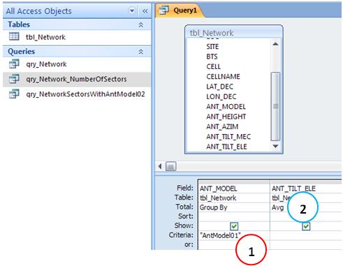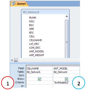 To achieve our goal, we need to include the criterion ‘AntModel01’ in the line of field criteria ANT_MODEL (1), and change the Group By option line of the field ANT_TILT_ELE to Medium (2).