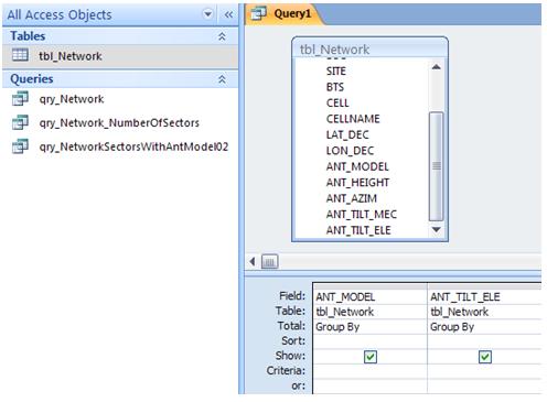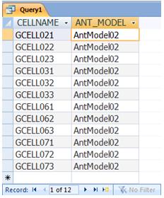 Going a little further, to finish by today, suppose we need to show that the sectors that use antenna model ‘AntModel02’. For this, we create the query qry_Network_SectorsWithAntModel02.