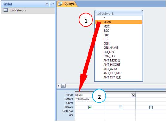 The simplest form of consultation is to show all data from all fields of the table. The consultation is being built according to our need, and can contain only one field, or all the available fields. To add a field to a query, you can double-click the desired fields (1), and also click on the desired fields, hold the mouse clicked and drag to query fields (2).