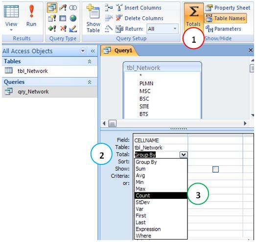 Next, Menu Design, we clicked Totals (1) - the button with the symbol of summation. Clicking this button, a new line appears in the query, the row Total (2), with some options, and group by default. Change this value to count (3).