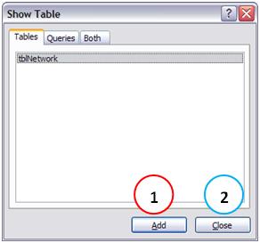 The new window displays the available tables in the database to be used in this query. Click the Add button (1) to add to our table (the only one so far and already selected), and then the Close button (2).