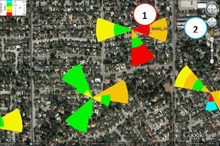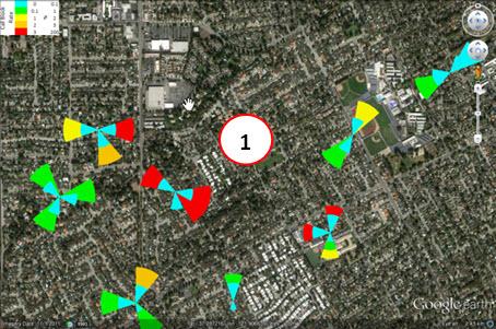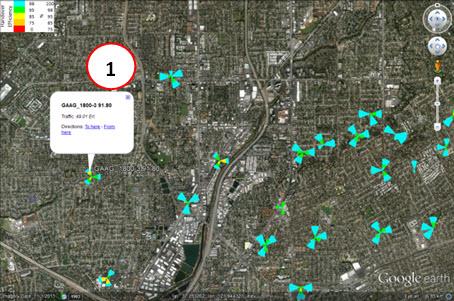 In the example of ‘Call Blocking Rate’ layer, we can easily identify the areas where the call blocking is more expressive (1). In addition, we can see for example an unbalance between different sites, in the same location.