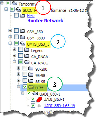 In the above example, we’ve unchecked all points. Then checked only what we want to show/see. In this case, we are analyzing ‘SUCC_P’ (1), the Efficiency Rate, which is the ‘root’ directory for this Indicator. Then we filter only the ‘UMTS_850_1’ folder (2), i.e. cells UMTS, band 850 MHz and with 1 Carrier. And finally we do a ‘drill down’ even deeper, choosing only those cells with Efficiency between ‘0 and 75%’ (3) - checking the corresponding folder that contains these cells.