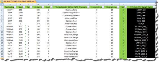The last table is the ‘tbl_Aux_TECHNOLOGY_BAND_CARR’. This table is important because it defines the characteristics of every type of cell that we have on the network. And when the ‘USE’ field of its row is marked, it will be created a sub-folder on Google Earth, grouping this information.