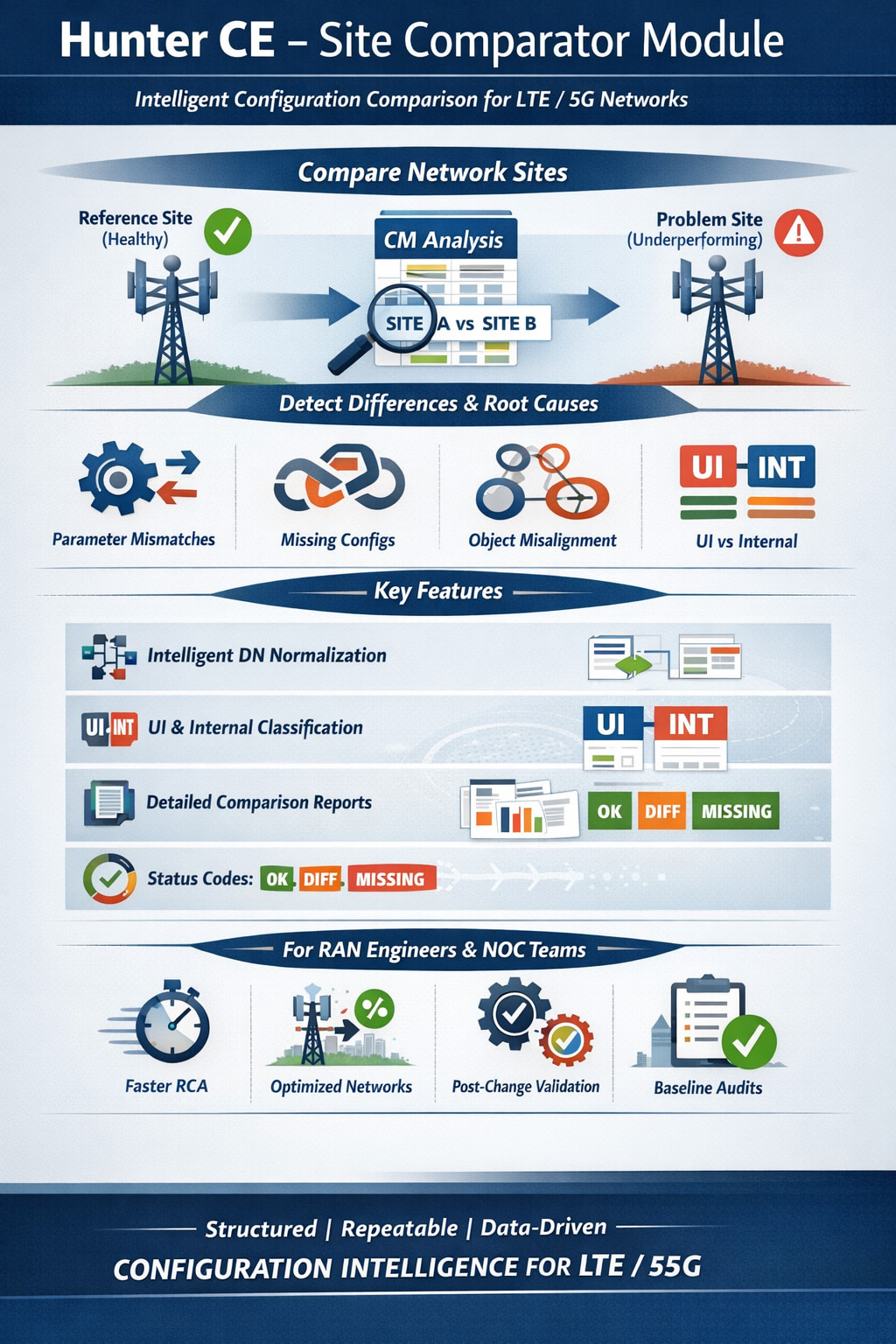 The Hunter Site Comparator is a configuration analysis module designed to compare two network sites - typically one “healthy” (reference) site and one “problematic” site - using consolidated configuration data (CM).