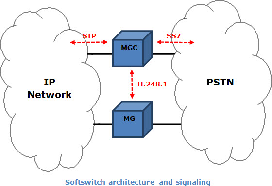 The MGC controls the MGs assigned to it through a IP-carried signaling protocol whose specifications are found on ITU-T Reccomendation H.248.1 – Gateway Control Protocol: version 3. The picture below shows how the softswitch elements interconnect with IP and Public Switchet Telephony Network (PSTN) and the signaling protocols used.
