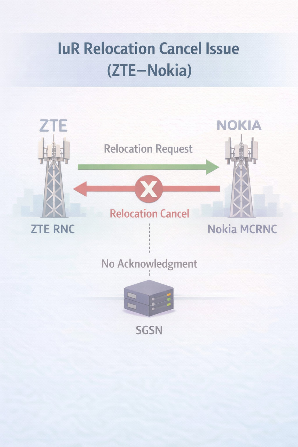In PS-only and CS+PS scenarios, the ZTE RNC sends a Relocation Cancel message. This appears to happen because the relocation request is not acknowledged toward the SGSN.