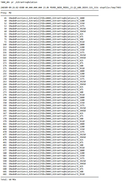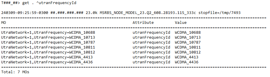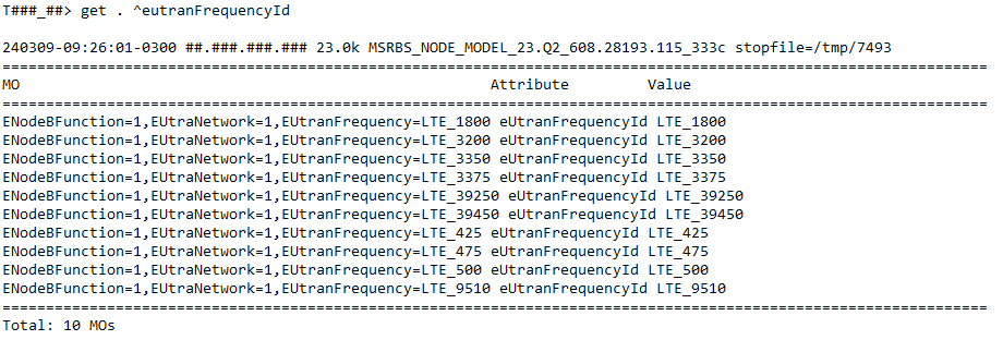 get . ^utranFrequencyIdandget . ^eutranFrequencyId: These two commands are used to check the configured frequencies in the system. The first is specific to UTRAN (3G), while the second targets EUTRAN (LTE/4G). -