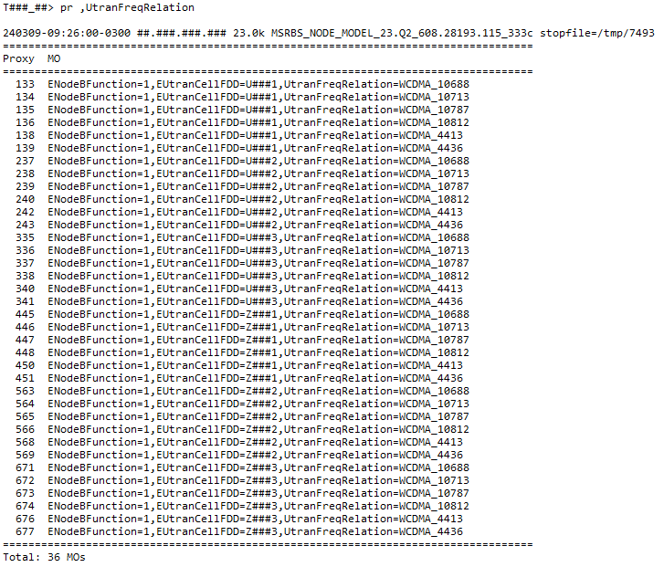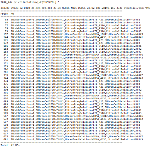 pr cellrelation=[WCQTUVYZPOL].*: This command provides a broader view of cell relations across different technologies and frequencies, including both UTRAN and EUTRAN.
