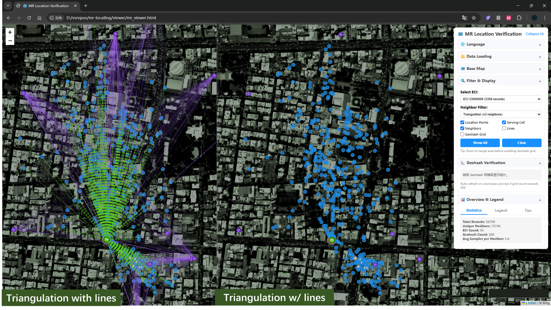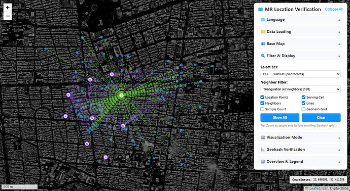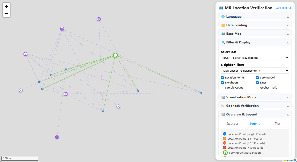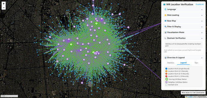 After completing the positioning process, selecting one base station’s MR dataset and visualizing the positioning results on a map produces this effect—green represents the serving cell base station, purple represents neighbor cell base stations, with lines indicating measurement relationships.