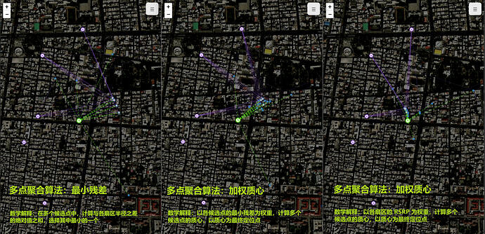 In this diagram, we can see that one serving cell may have dozens of neighbor cells, with hundreds of positioning results scattered across the regions between these dozens of neighbor cells. In very early versions, due to parameter issues, these positioning points would exhibit concentrated distributions at specific locations (such as the serving base station) or specific routes (serving-neighbor base station connection lines). After algorithm refinement, these issues have been resolved, and abnormal distributions no longer occur.