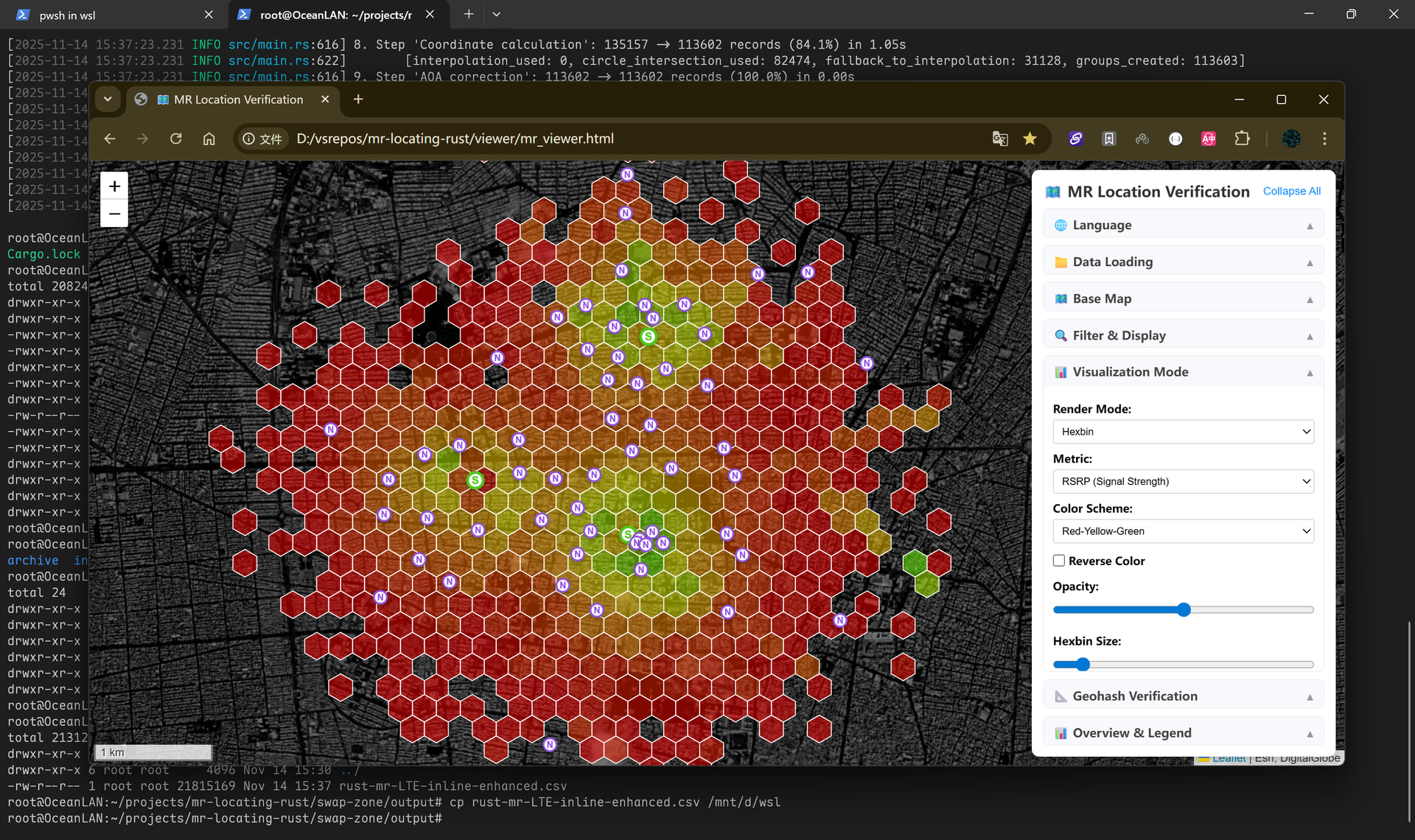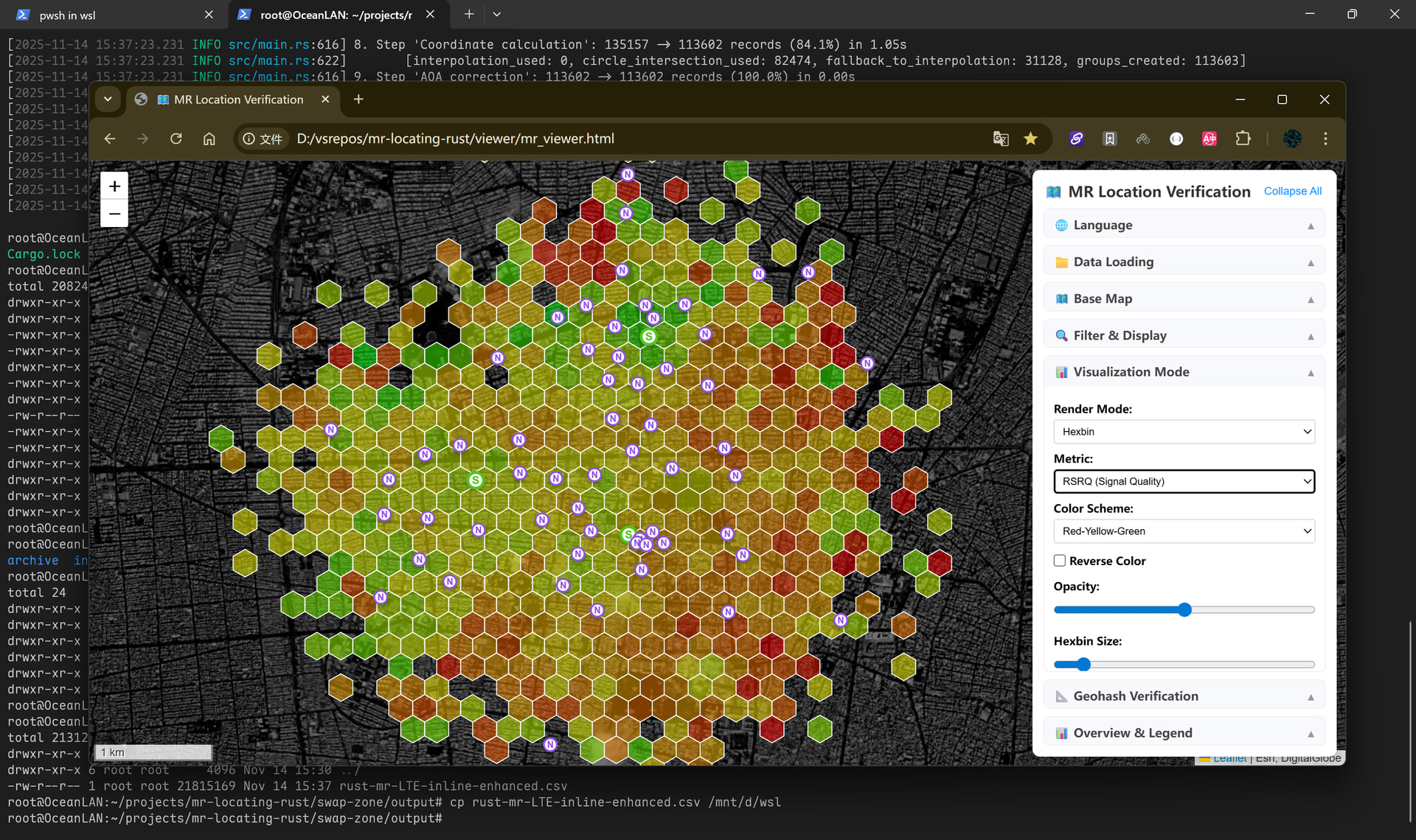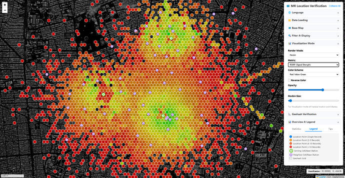 Using positioned measurement metrics to generate a rendered map for coverage quality analysis—this is an RSRP Hexbin grid rendering, clearly showing the base station’s “under-the-tower blackout” effect!