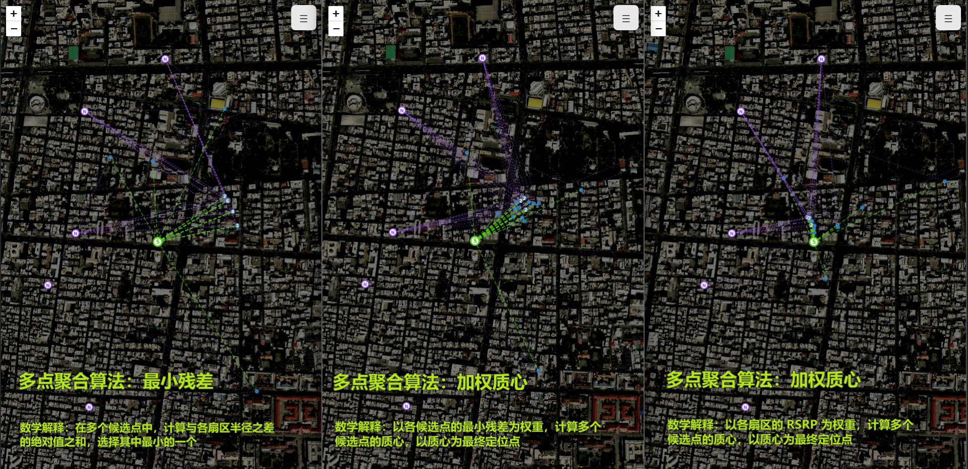 - Circle Intersection Method: Calculate pairwise circle intersections from multiple cells, then apply configured fusion strategies (such as minimum residual, weighted centroid, least squares, etc.) to obtain coordinates; fallback to interpolation when neighbor cells are insufficient or geometric degradation occurs