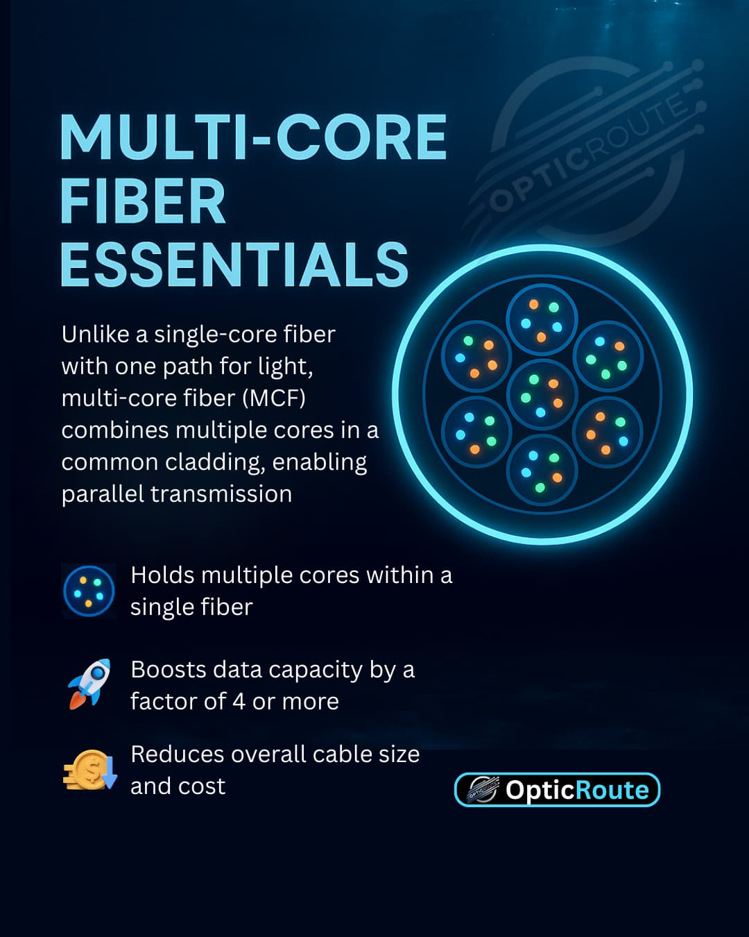 Unlike traditional single-core fibers with just one light path, Multi-Core Fiber (MCF) places multiple cores inside a single cladding, multiplying capacity while keeping the cable size the same.