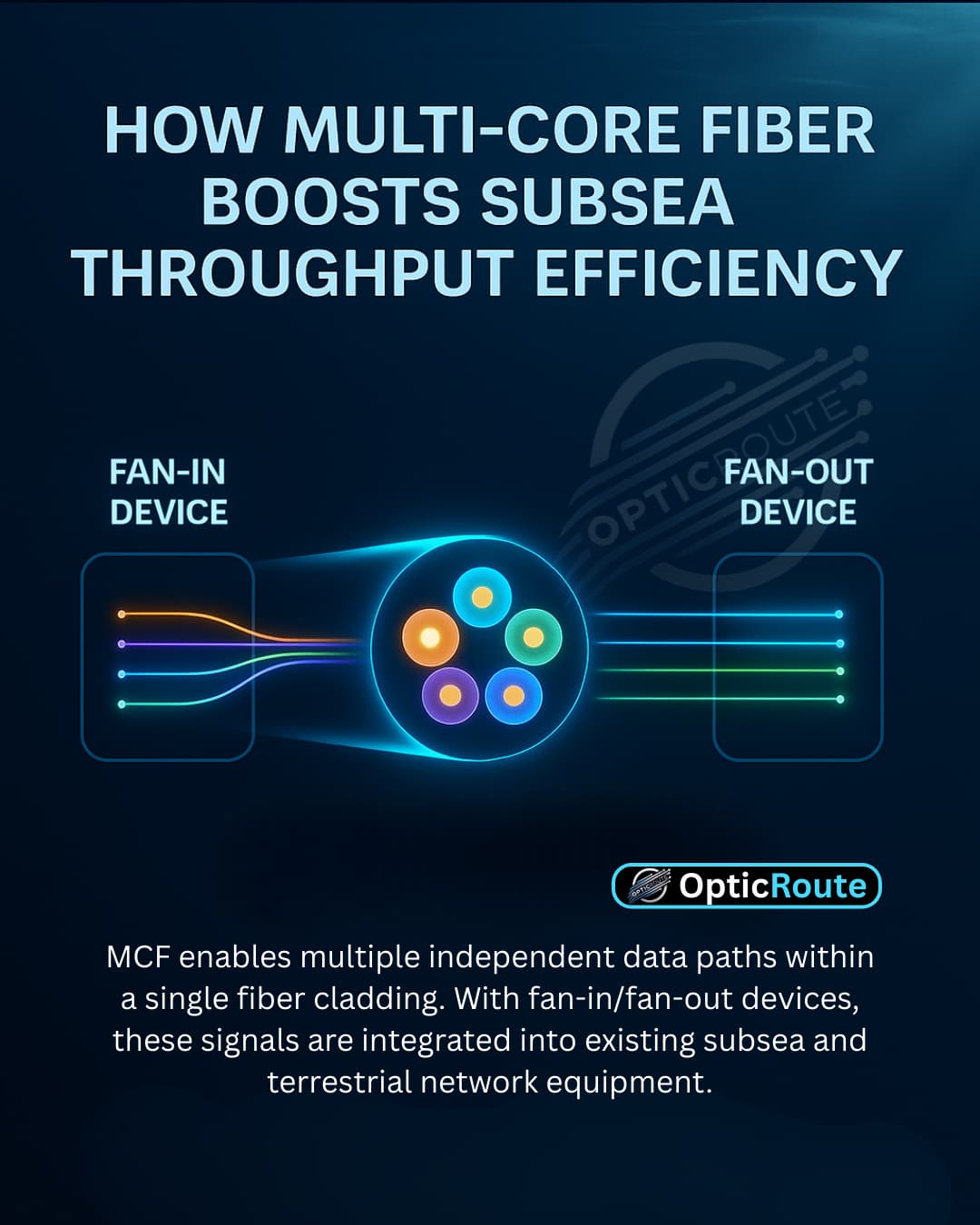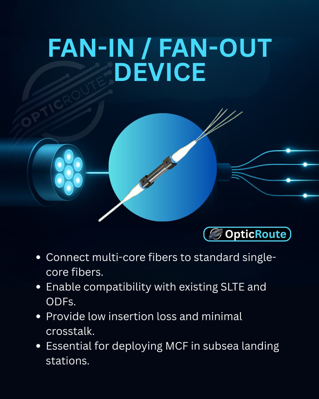 Fan-In/Fan-Out devices connect MCF to standard single-core equipment, ensuring seamless compatibility with existing SLTE and landing stations.