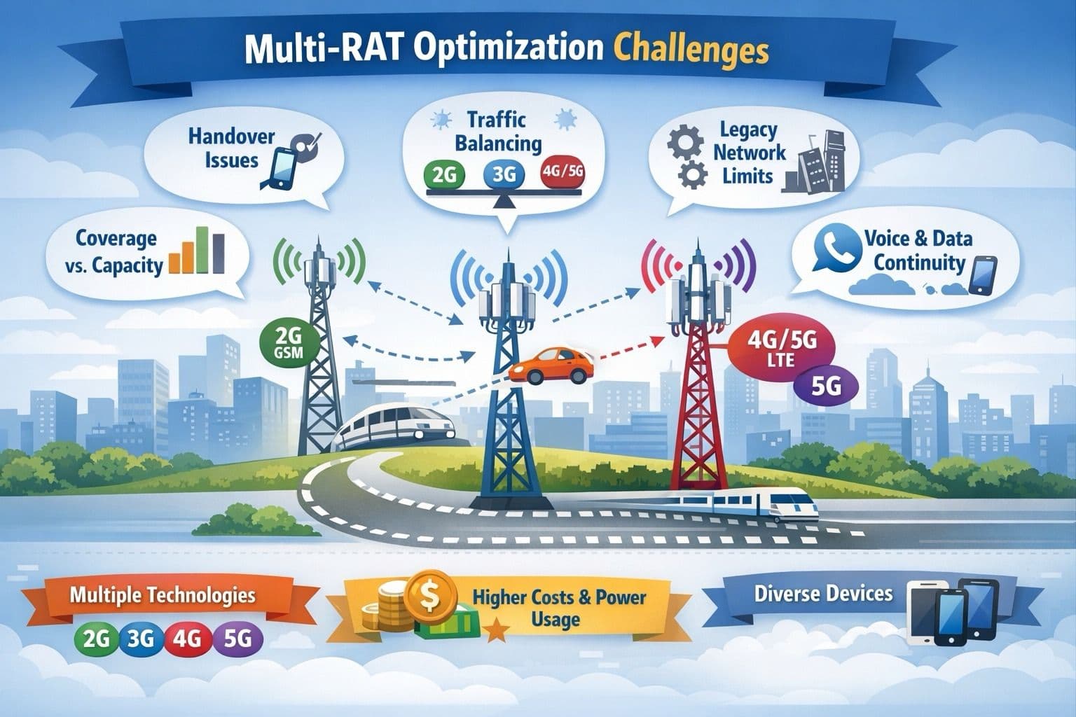 - Low-frequency bands provide wide coverage, while high-frequency bands offer higher capacity. Optimizing both simultaneously across multiple RATs is complex.