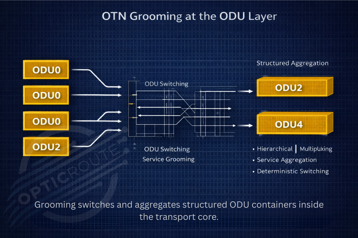 Multiple ODU containers entering an OTN cross connect and merging into higher rate container.