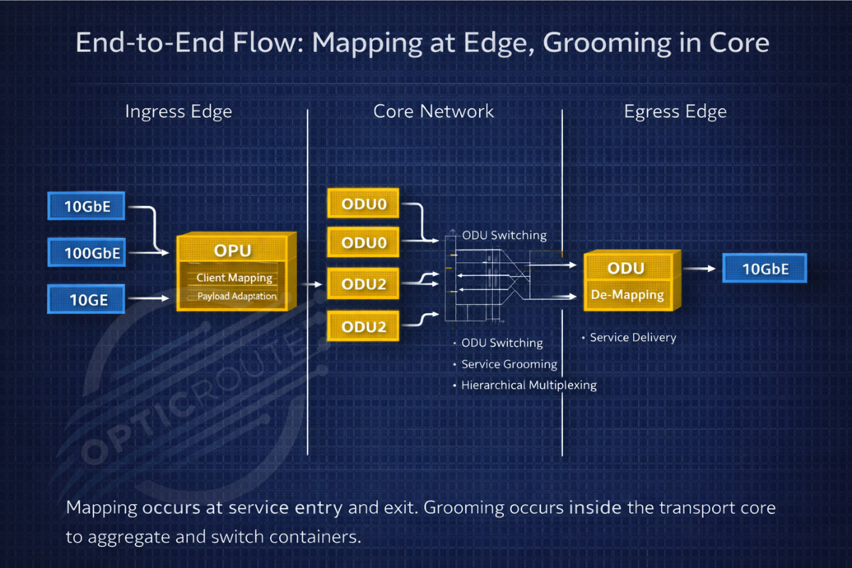 End to end flow showing client mapping at ingress and grooming in core network.