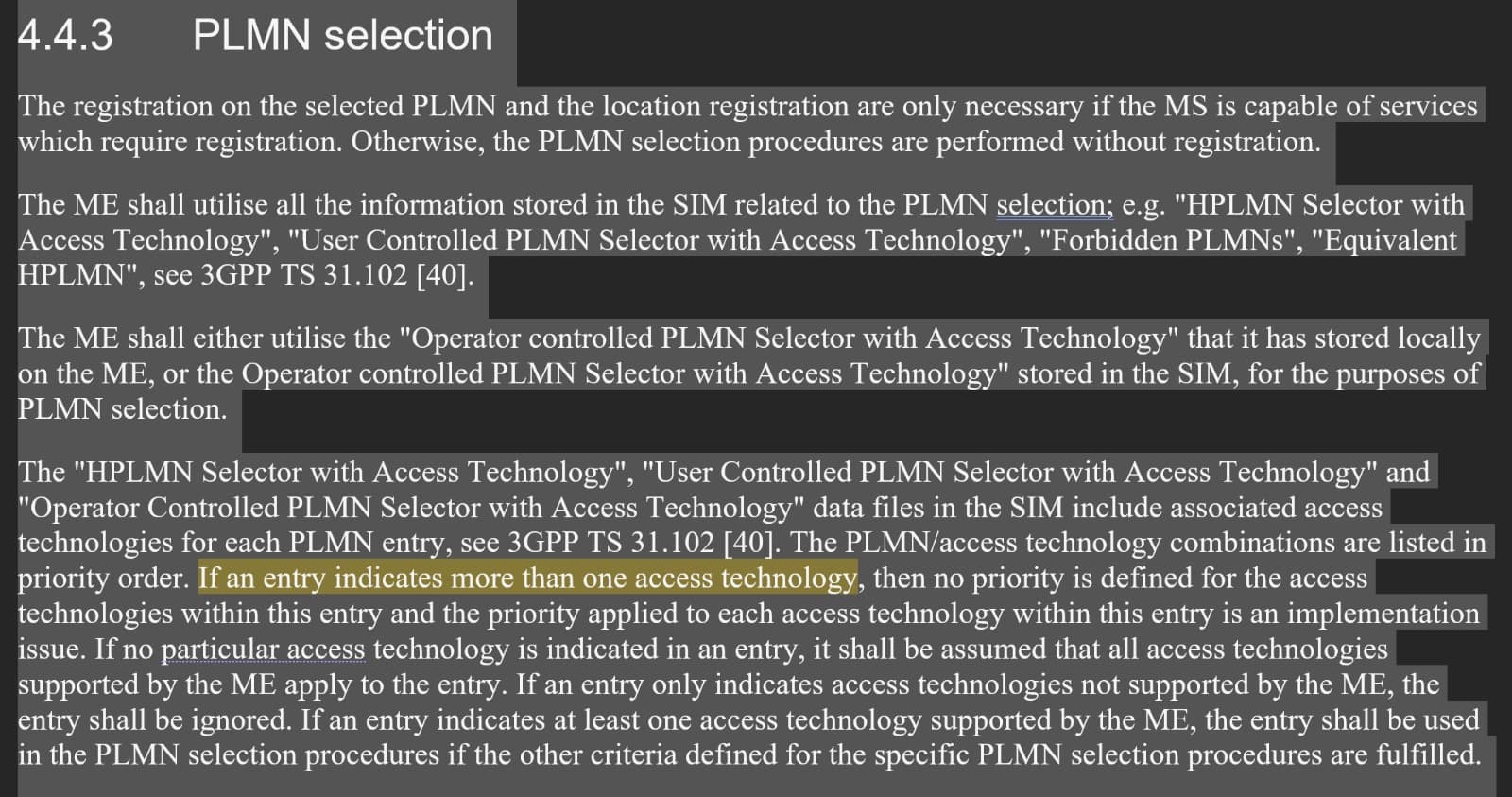 PLMN selection: “If an entry indicates more than one access technology” meaning