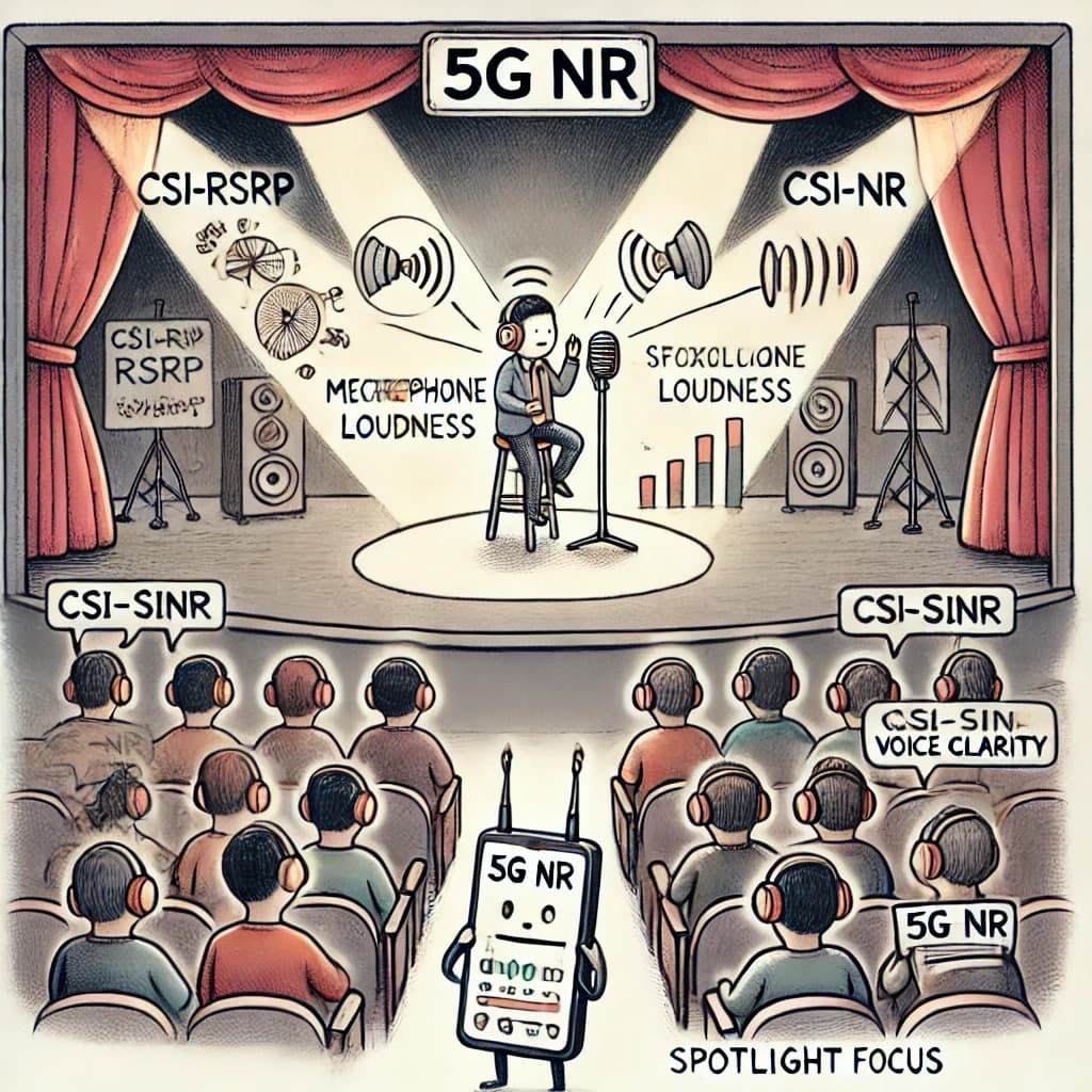 Imagine CSI-SINR as evaluating how clearly you can hear a performer on stage amidst a noisy audience. While CSI-RSRP measures how loud the performer’s microphone is, and CSI-RSRQ checks how focused the spotlight is on them, CSI-SINR determines how much of their voice stands out against the background chatter (interference and noise). In 5G City, this clarity check is new and essential, ensuring the performer’s voice is always clear, even in a noisy or crowded environment. This helps your phone decide whether to stay with the current performer or switch to a clearer one, ensuring the best listening experience (reliable connection) at all times. [In a Nutshell: CSI-SINR is like checking if the performer’s voice is loud and clear above the noise, ensuring your phone stays connected to the best signal.]