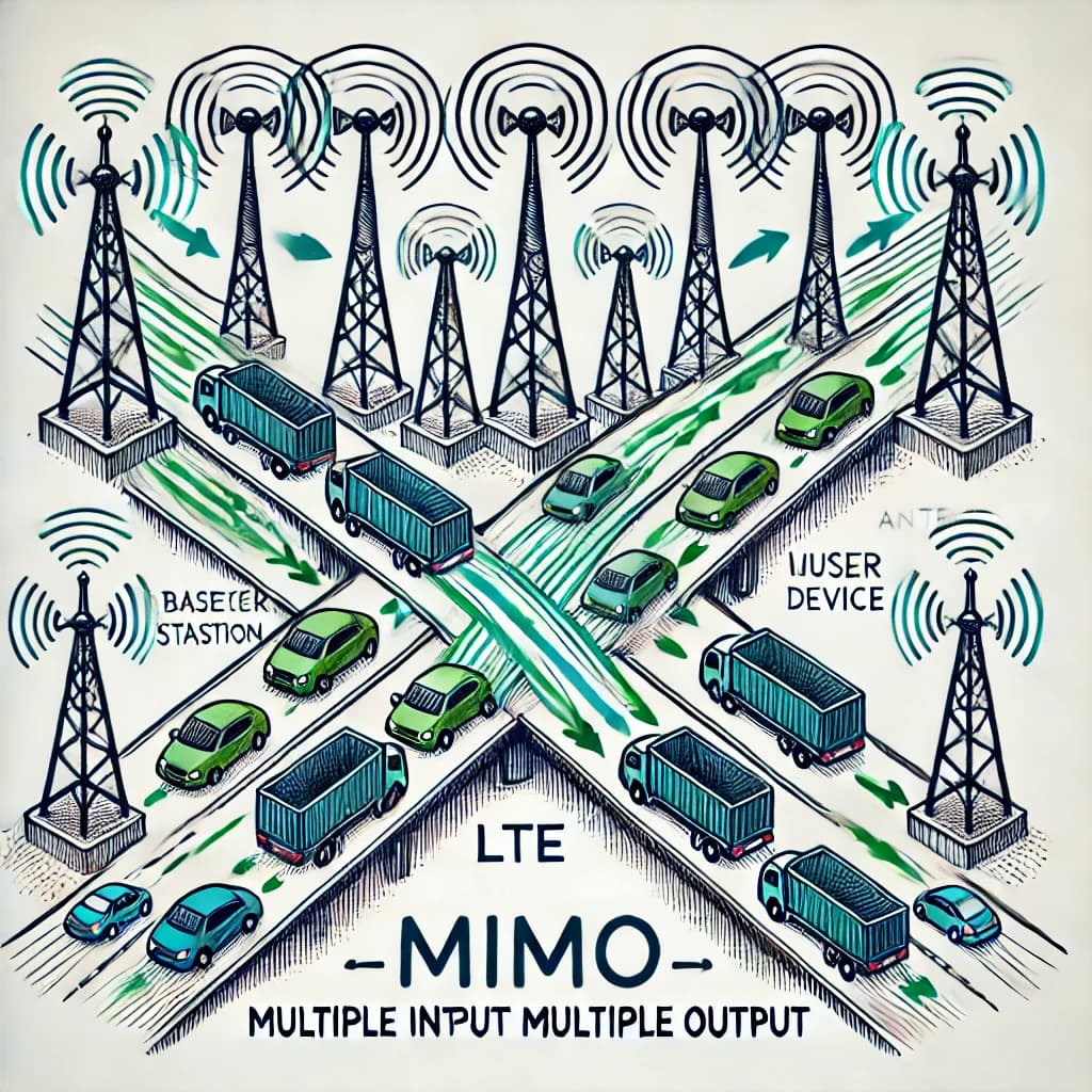 Multiple Input Multiple Output (MIMO) is when we use more than one antenna at the same time (like a multi-lane highway). This helps send and receive more information all at once, making things faster.