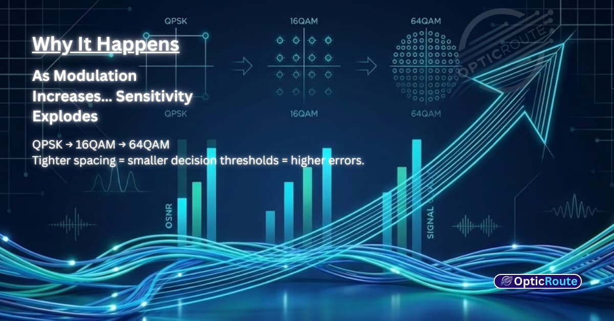 As you push from š¤š£š¦š ā šš²š¤šš ā š²š°š¤šš the constellation points tighten the decision boundaries shrink and the signal becomes extremely sensitive to