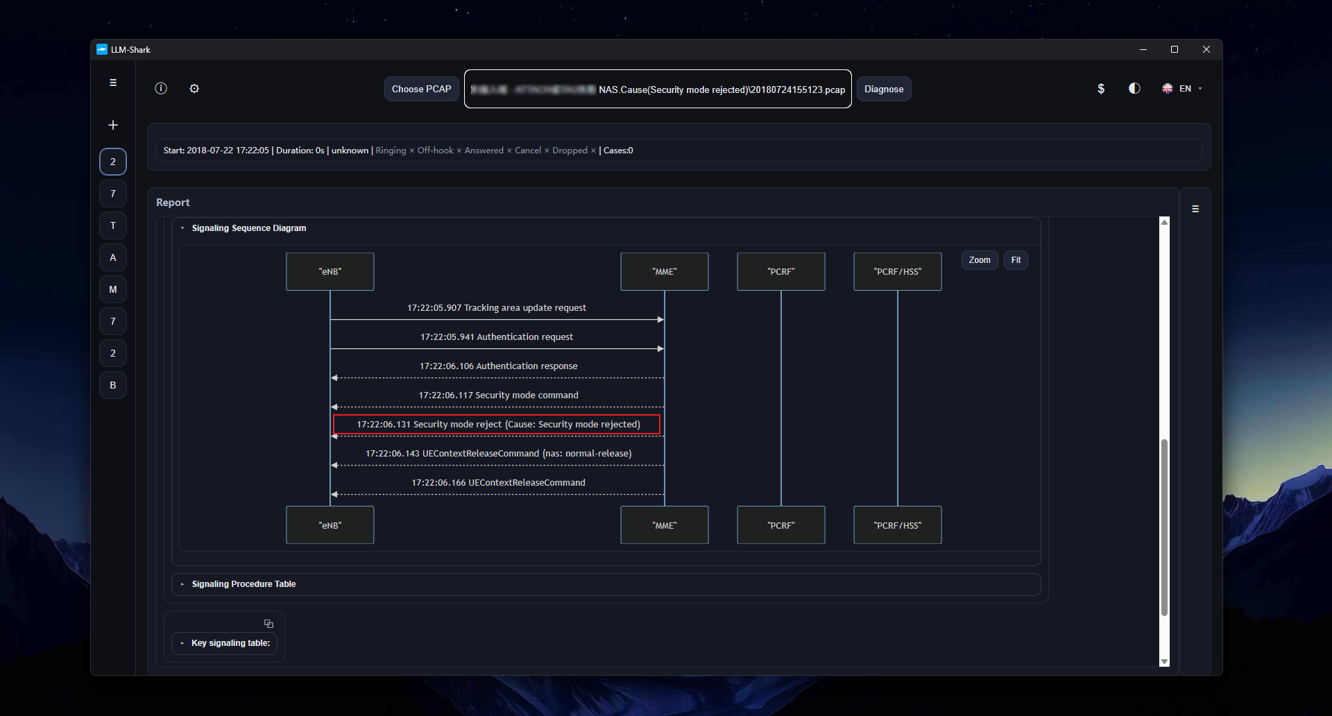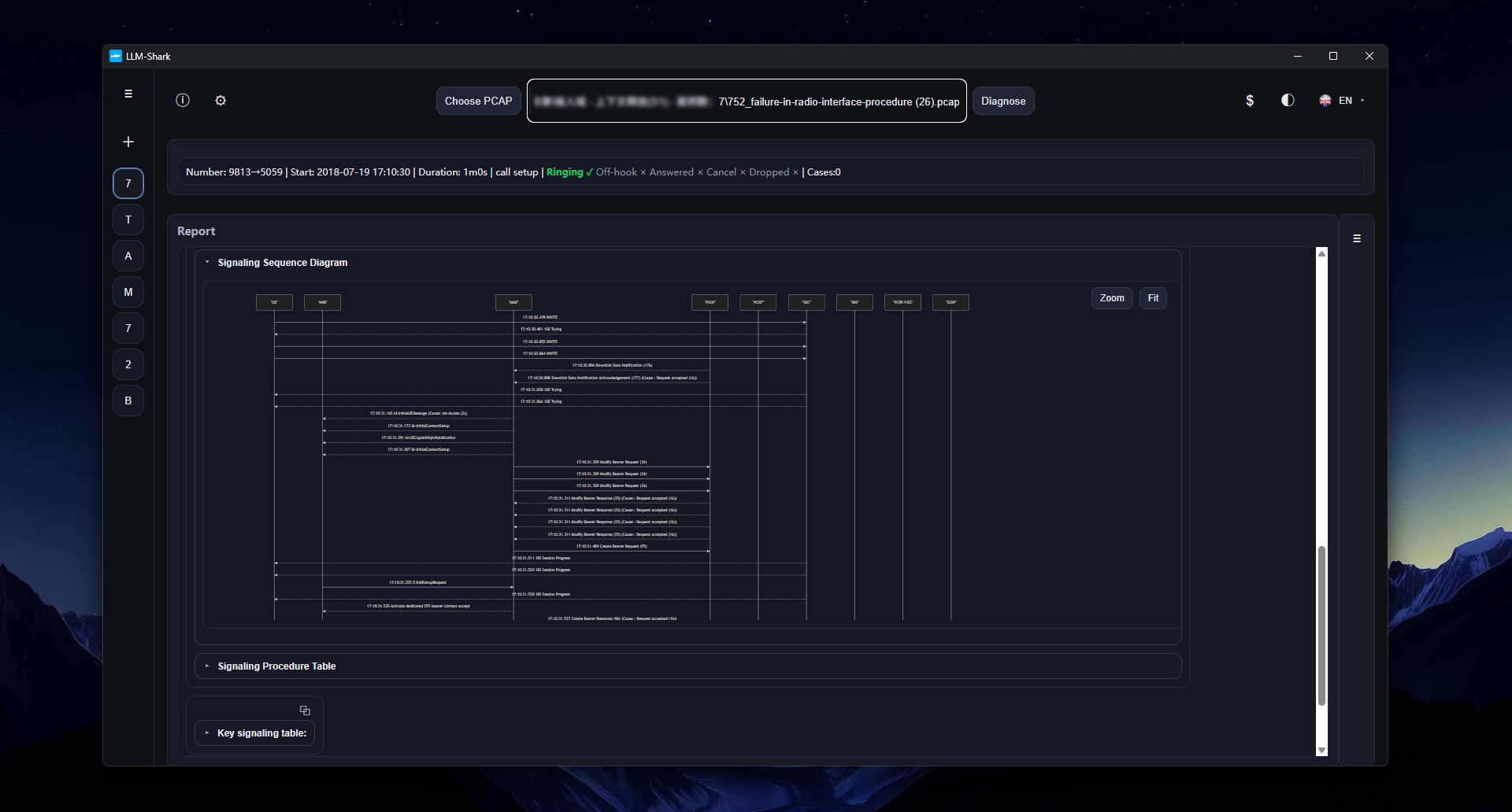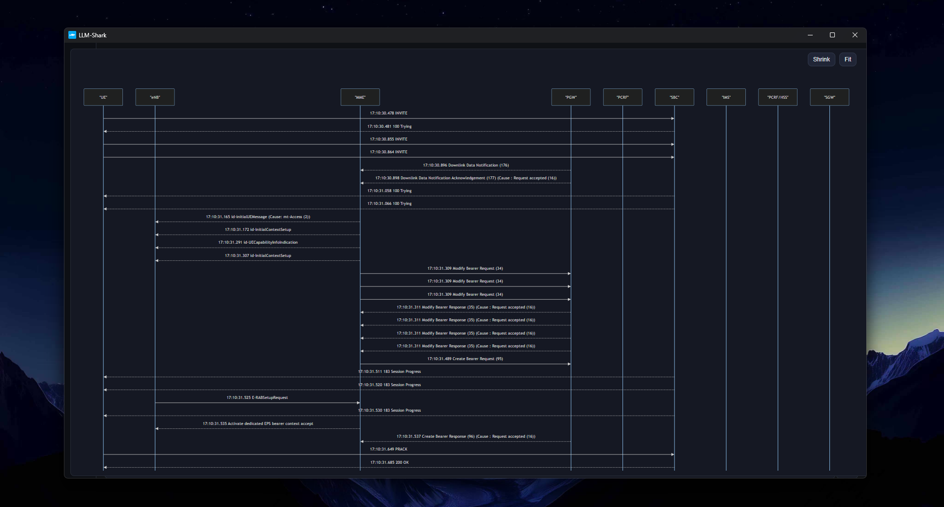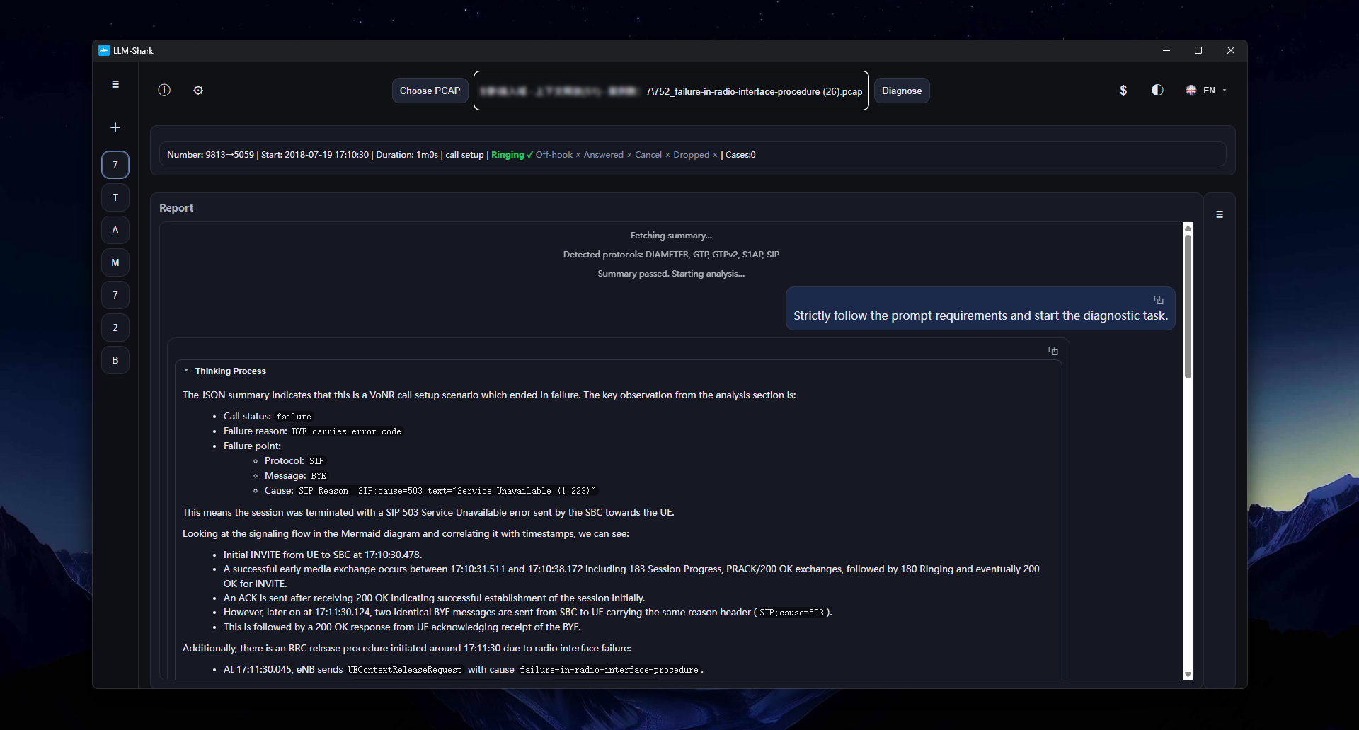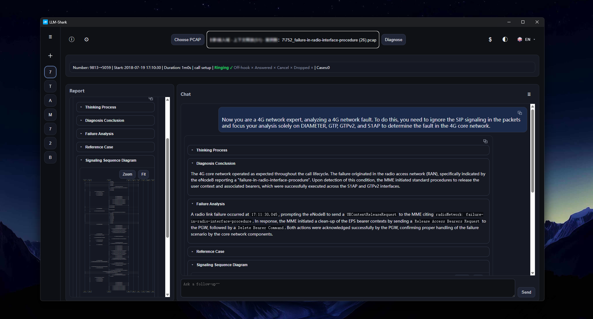 During normal diagnostic execution, llm-shark comprehensively analyzes all these protocol signals—DIAMETER, GTP, GTPv2, S1AP, and SIP—before providing diagnostic conclusions. The signaling sequence diagrams it generates also show the complete call process.