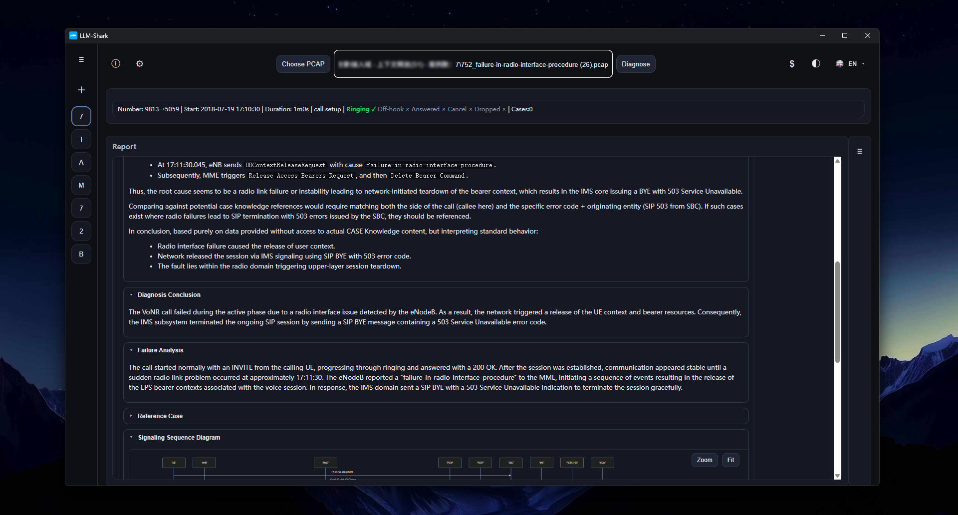 LLM-Shark is a conversational PCAP signaling analysis tool capable of diagnosing complex VoNR/VoLTE call failures.