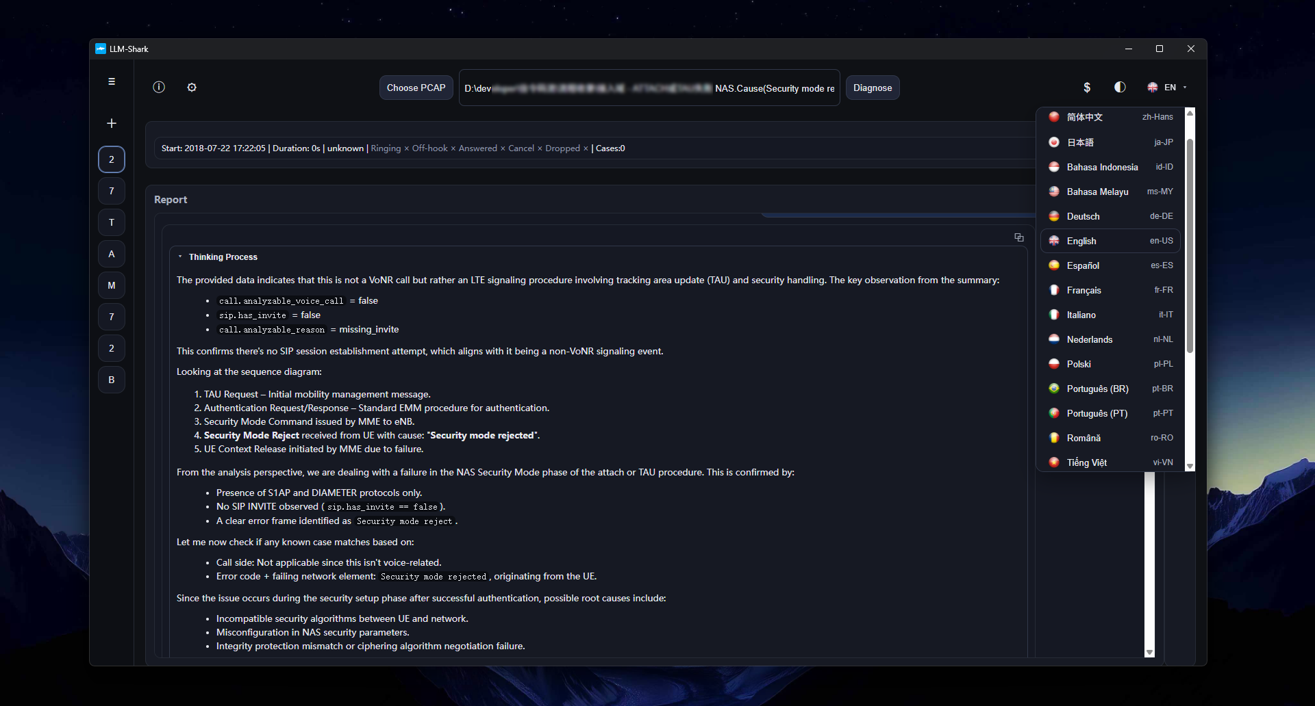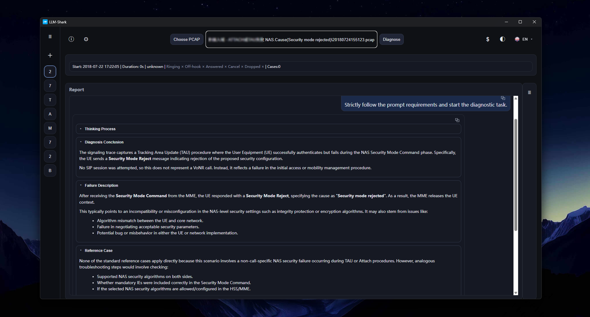 llm-shark transforms into a 4G core network expert and re-analyzes, providing diagnostic conclusions. For example, in this case, its conclusion was that there was no problem with the core network—the fault appeared in the access network.