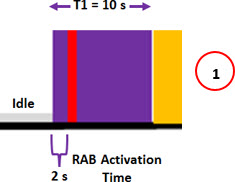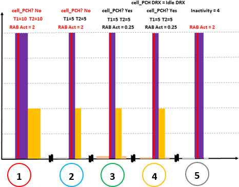 In the first example (1) we have the time T1 and T2 (= 10 seconds) high, in a network that does not have PCH states, and therefore always has a RAB high activation time (= 2 seconds).